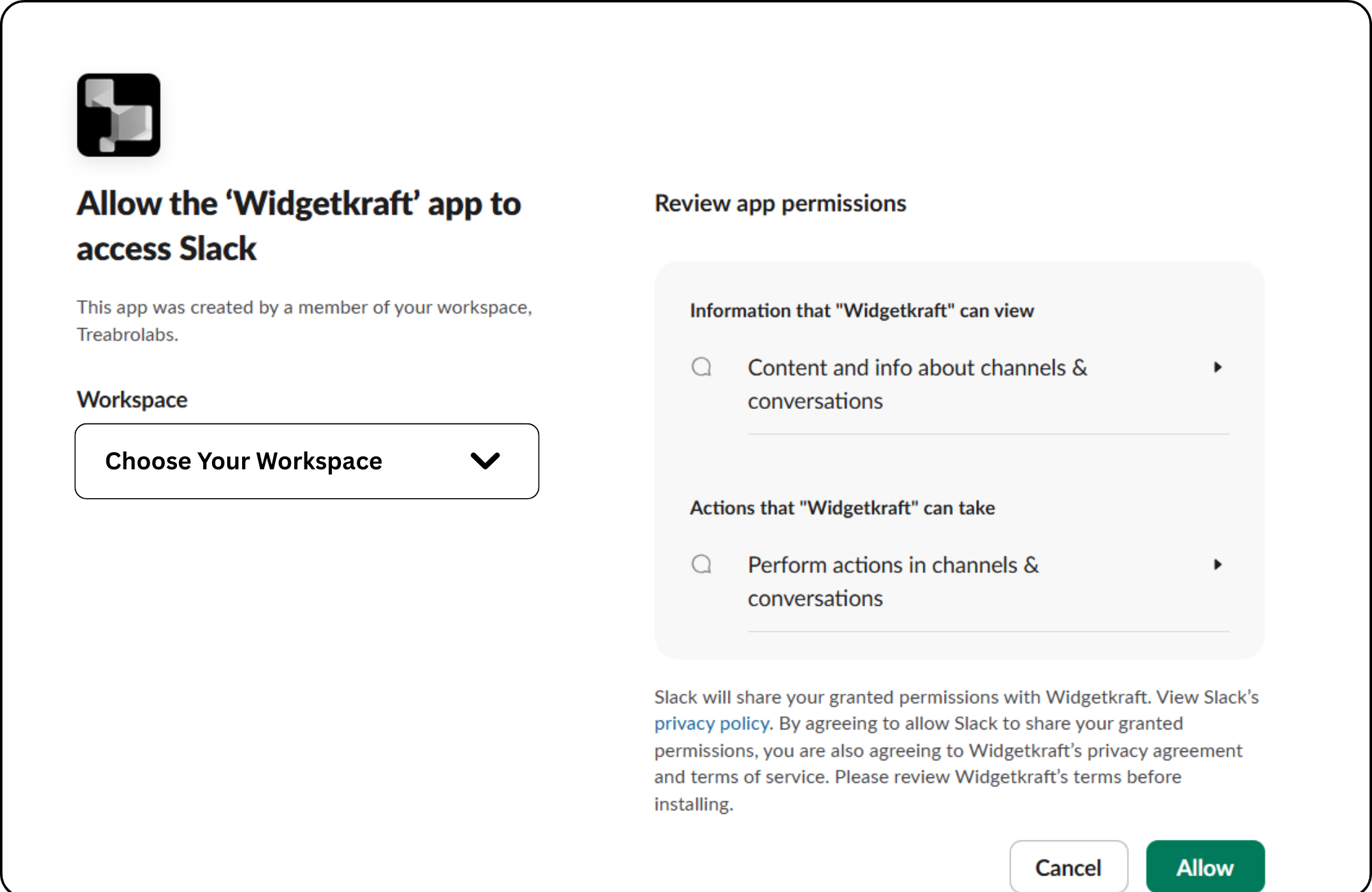 Grant WidgetKraft permission to access your Slack workspace and channels.