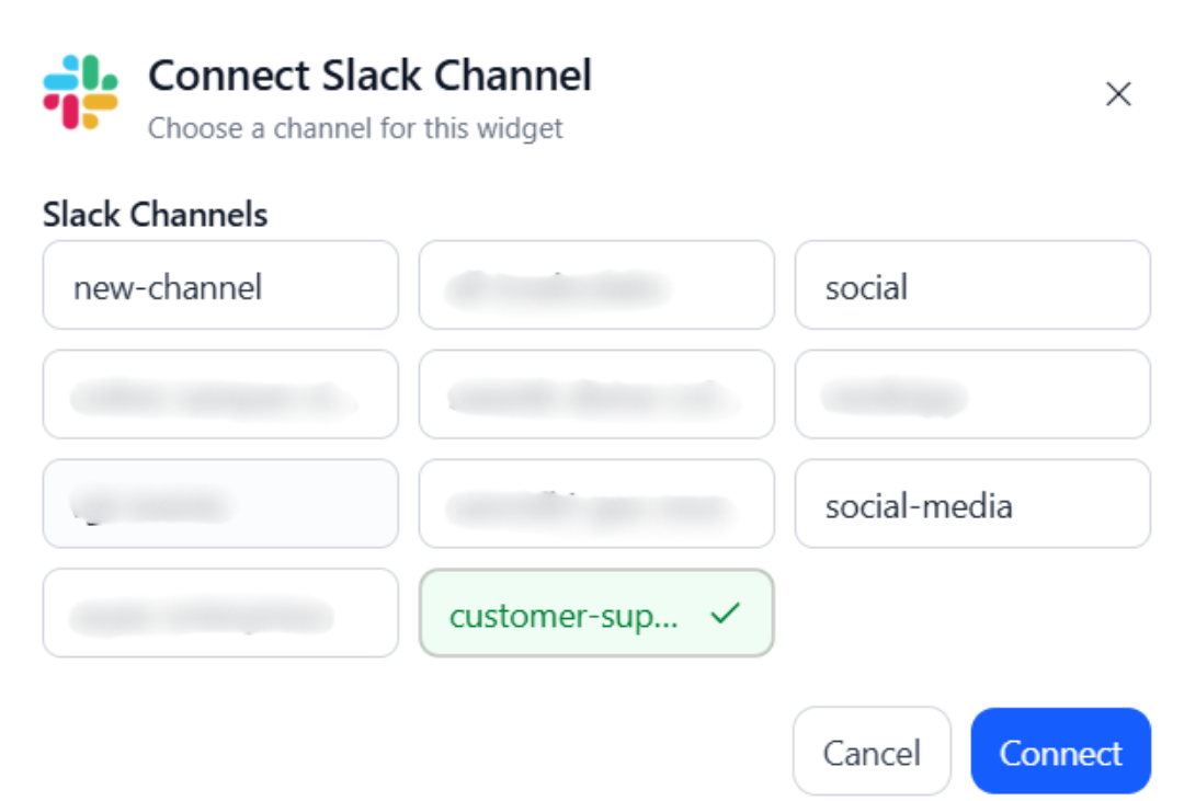 - The modal will close and the widget will now be connected to that Slack channel